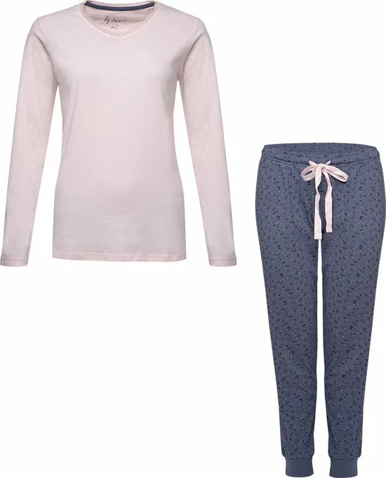 By Louise dames pyjama set van katoen met lounge mouwen en v-hals met kant. Broek met manchetten.