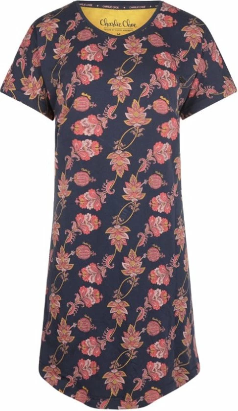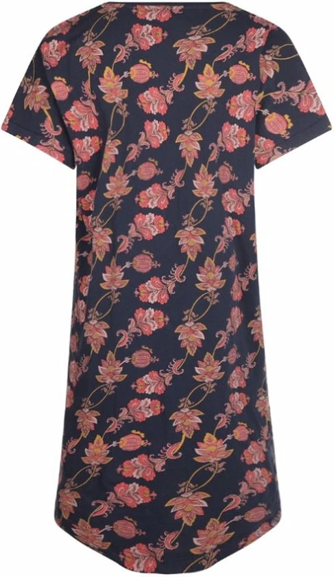 Een heerlijk donkerblauw slaapshirt met bloemenprint. Het slaapshirt heeft korte mouwtjes en loopt aan de onderkant rond.