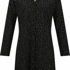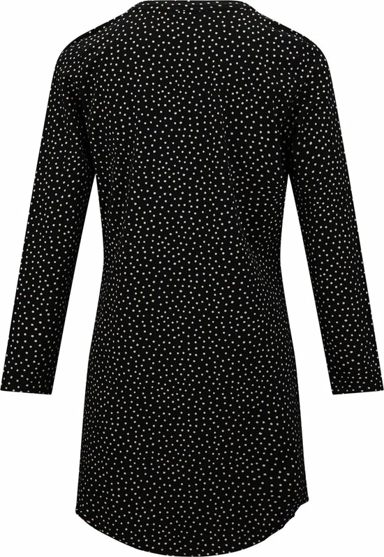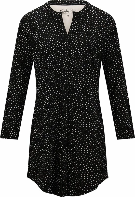 Een zwart stipjes nachthemd met een V-hals en doorlopende knoopjes. Het Charlie Choe nachthemd komt tot op de knie en heeft een rondlopende voor-en achterkant. Een fijn nachthemd met een lange mouw, voor de koudere winternachten. * Stipjesprint * V-hals met knoopjesrij tot halverwege * Rondlopende voor-en achterkant * Lange mouwen * Lengte: op de knie * Fijne zachte katoen Samenstelling Charlie Choe Slaapshirt Wild Dames: 95 % Katoen 5 % Elastan Onderhoudsinstructies: – Machinewasbaar op 40 graden – Niet bleken – Drogen in wasdroger niet aan te raden – Niet heet strijken, voorzichtig bij strijken met stoom – Stomen is toegestaan