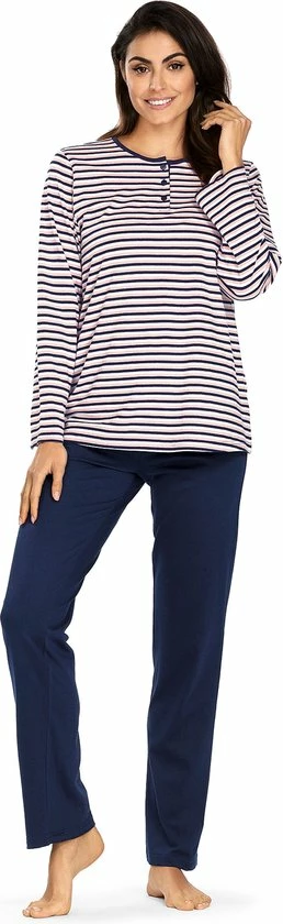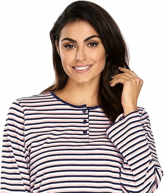 De pyjamatop heeft een ronde hals met handige knoopjes en gestreept in de kleuren blauw, wit en roze.