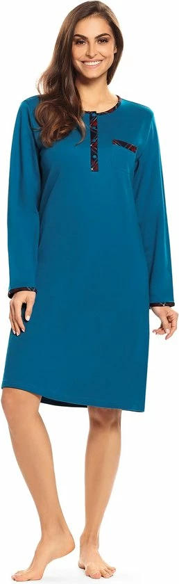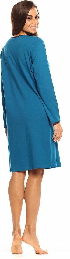 Ga heerlijk warm de nacht door met dit nachthemd van Comtessa uit de ‘Pleasuredome Checks’ collectie. De dikke katoen interlock kwaliteit zorgt er voor dat dit nachthemd extra warmte biedt. De ronde hals heeft een knoopsluiting met 4 knopen en is afgewerkt met een geruit patroon. Verder is dit effen oceaan blauwe nachthemd voorzien van een borstzakje. Gemaakt van 100% katoen interlock en de lengte is 100cm. Met dit nachthemd ben je klaar voor de winterse nachten!