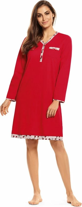 Een stijlvol effen rood gekleurde dames nachthemd van Comtessa met lange mouwen en een perfecte pasvorm. De top heeft een v-hals met een knoopsluiting van 3 knopen die is afgewerkt met een licht grijs gebloemde rand. Verder heeft heeft het een borstzakje die voorzien is van een strikje. Het nachthemd is het gemaakt van 100% gekamde katoen waardoor het een extra fijne draagcomfort geeft. De onderkant van het nachthemd is met dezelfde licht grijs gebloemde rand afgewerkt en het heeft een lengte van 100cm.