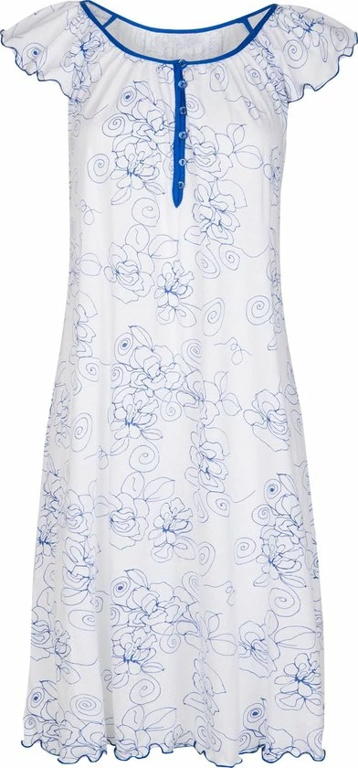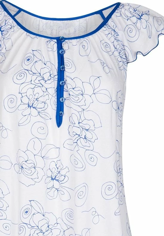 Een nachthemd van Cybèle die ideaal is voor elk zomers moment van de dag! Dit witte nachthemd met blauw gebloemd patroon heeft kapmouwen en is gemaakt van 100% katoen. Het nachthemd heeft een wijde ronde hals met een knoopsluiting van 6 knopen die is afgewerkt met een donker blauwe bies. De lengte is 90cm.