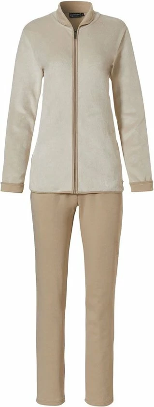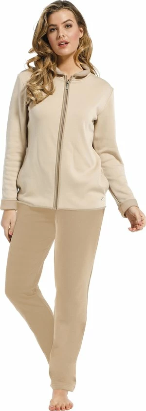 Dames huispak in een mooie velours kwaliteit van de Pastunette De Luxe serie. Top met rits en klein kraagje 64% polyester, 32% katoen en 4% elastan. Uni lange broek in beige kleur 74% viscose, 21% polyester en 5% elastan.
