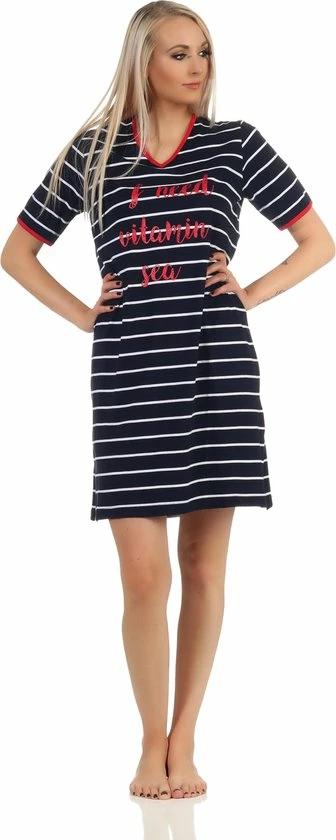 Dames nachthemd van het merk Normann in 100% katoen. Nachthemd korte mouw, kleine V hals in een streep dessin met leuke print. In de kleuren donker blauw en wit.