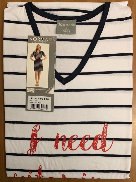 | Materiaalbeschrijving | Dames, nachthemd, van, het, merk, Normann, in, 100%, katoen., Nachthemd, korte, mouw, kleine, V, hals, in, een, streep, dessin, met, leuke, print., In, de, kleuren, donker, blauw, en, wit. |