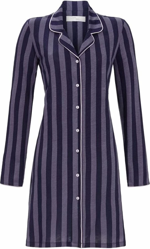 Een gestreept doorknoopnachthemd van Ringella uit de ChΓ©rie Line collectie. Het nachthemd heeft lange mouwen en een reverskraag. Langs de knoopsluiting, kraag en mouwuiteinden loopt een witte bies. Het patroon van het nachthemd bestaat uit brede nachtblauwe en grijze strepen. Productspecificaties: Comfort size: Dit artikel heeft een ruime pasvorm. Stofsamenstelling: 50% katoen, 50% modal Lengte: 90 cm Merk en collectie: Ringella ChΓ©rie Line Seizoen: Herfst/Winter Modal is een biologische textielsoort gemaakt van cellulose uit de beuk. Het is ongeveer 50% hygroscopischer dan katoen.