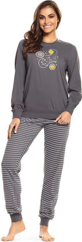 Een leuke dames pyjama van Comtessa. Het pyjamashirt heeft lange mouwen met boorden en een ronde hals. Op het shirt staan zonnen, manen en sterren afgebeeld. Hier tussen staat de tekst -ItΒs written in the stars-. De lange pyjamabroek is gestreept. De broekspijpen hebben tevens boorden. De stof is gemaakt van puur katoen in single jersey kwaliteit. Productspecificaties: Stofsamenstelling: 100% katoen, single jersey Merk en collectie: Comtessa Seizoen: Herfst/winter