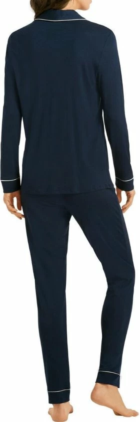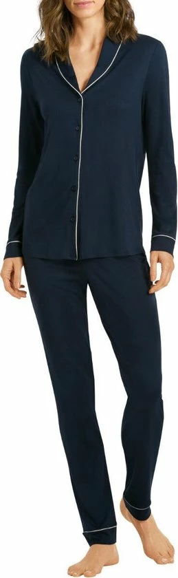 Stijlvolle damespyjama met lange mouwen en benen uit de serie Natural Comfort. Deze klassiek gesneden pyjama is licht, zacht en heerlijk soepel. Hij is gemaakt van 100% duurzame TENCEL lyocell-vezel, die ademend is en de temperatuur reguleert. Knopen en naaigaren zijn gemaakt van gerecycled polyester, waardoor ze deel uitmaken van de nachtkleding van een nieuwe, duurzame generatie. De knoopsluiting en de klassieke kraag, evenals de kleurcontrasterende biezen, ronden de look van deze luxueuze nachtkleding vakkundig af.