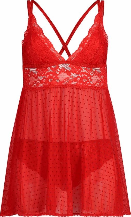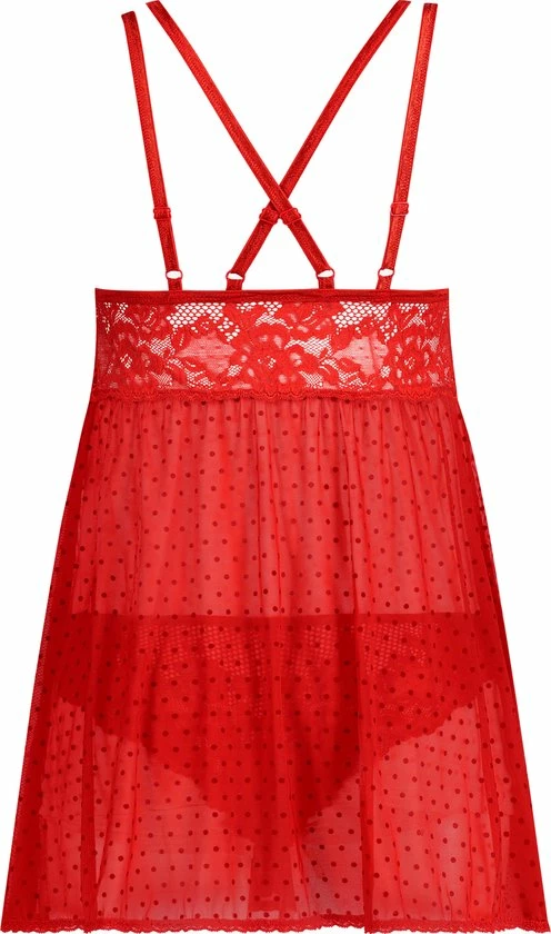 Voel je sexy in deze non-wired babydoll! De babydoll heeft kanten en mesh details, verstelbare bandjes en is afgewerkt met een stipjespatroon. De bijpassende slip is gemaakt van een mix van kant en mesh.