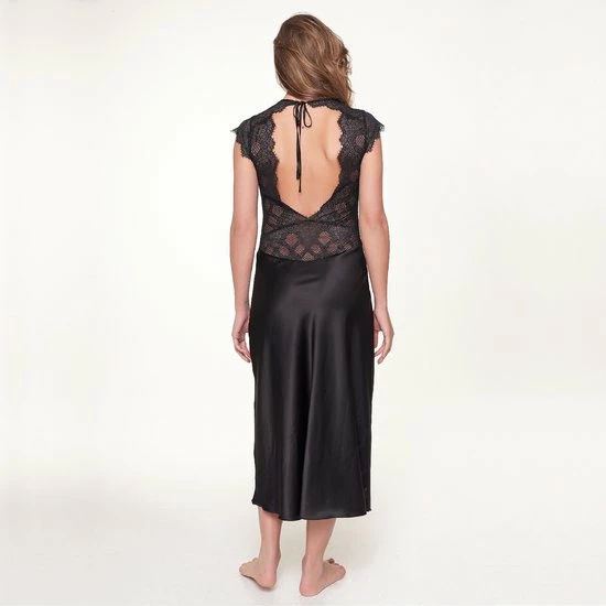 Black Peacock⦠Deze sexy maar toch stijlvolle zwarte lingerieserie is door haar kanten details een echte musthave voor jouw lingeriecollectie! De long dress is gemaakt van een satijnlook stof samen met kant en daardoor gedeeltelijk semi-transparant. De mooie diepe v-hals en open achterzijde zorgen voor een sexy uitstraling. De achterkant is vast te knopen doormiddel van een veterdetail.