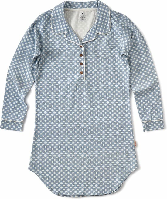 Klassiek nachthemd in grijsblauw met kraag voor dames van zachte jersey katoen met leuke all-over-print. Dit nachthemd heeft lange mouwen, een klassieke kraag en houten knoopjes. Leuke kontrast bies langs de graag en de sluiting.