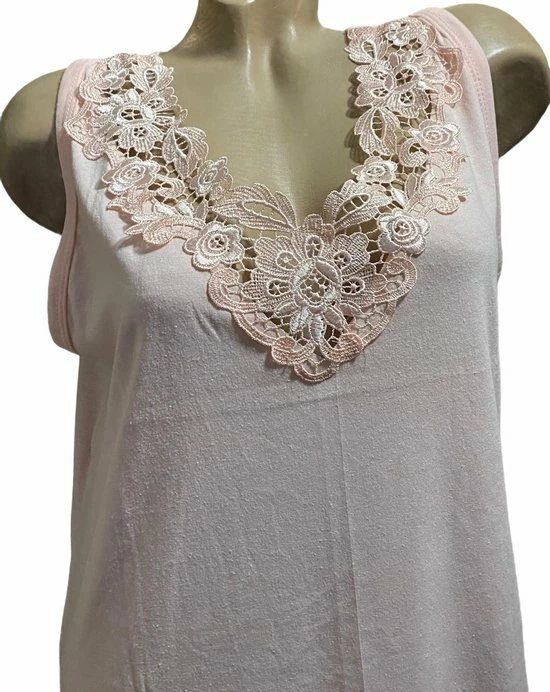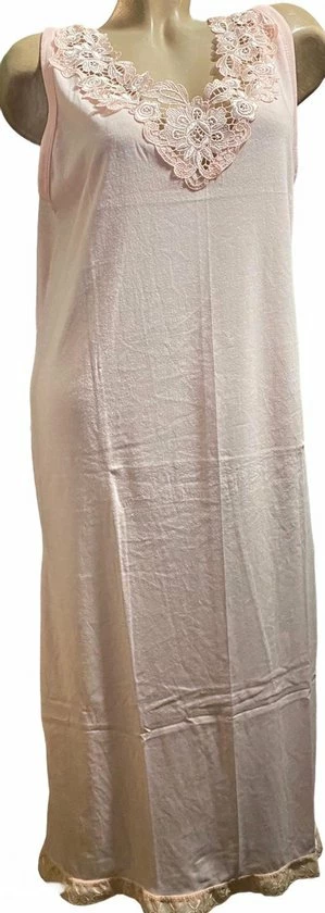 Een fijn dragend mouwloos nachthemd van 100% katoen, mooi afgewerkt met kanten details. Dit model nachthemd is ook geschikt als onderjurk. Dit nachthemd valt ruim.