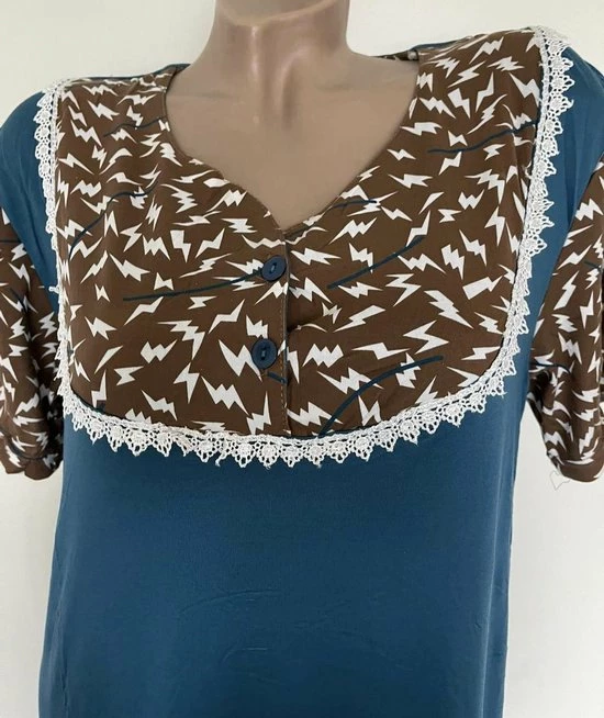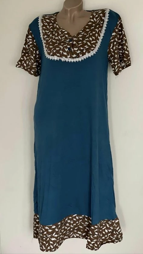 Een mooie nachthemd met korte mouwen en knoopsluiting en een leuke print van tricot stretch stof 90% katoen en 10% polyester. De nachthemd draagt comfortabel en de maat M valt ruim uit. Wasbaar op 40 graden.