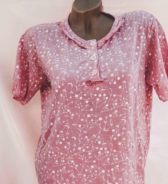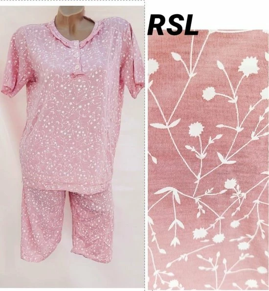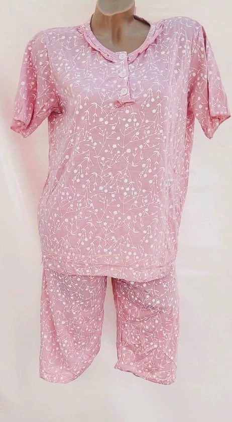 De pyjama set draagt comfortabel en bestaat uit een top met korte mouwen en ronde hals met knoopsluiting en een driekwart broek met een elastische tailleband. Het materiaal is gemaakt van 90% katoen en 10% polyester. De maat valt naar 36-38. Wasbaar op 40 graden.