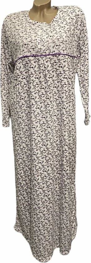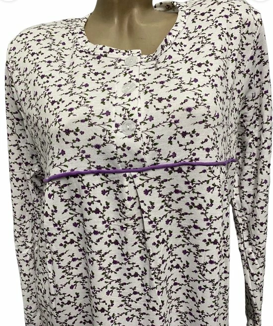 Een heerlijk zachte nachthemd warm gevoerd extra lang met bloemenprint. Het nachthemd heeft een ronde hals met knoopsluiting. De lengte van het nachthemd is circa 145cm lang en de maat valt ruim. Het materiaal is van 35% katoen, 65% polyester.