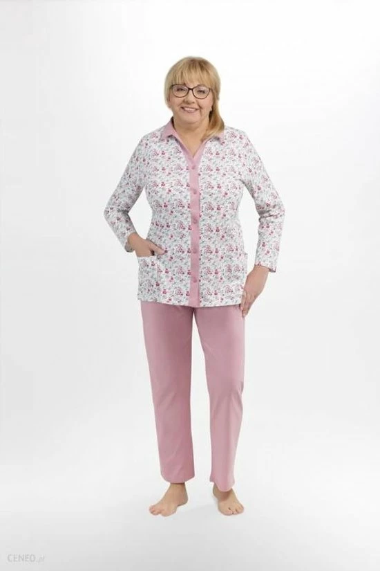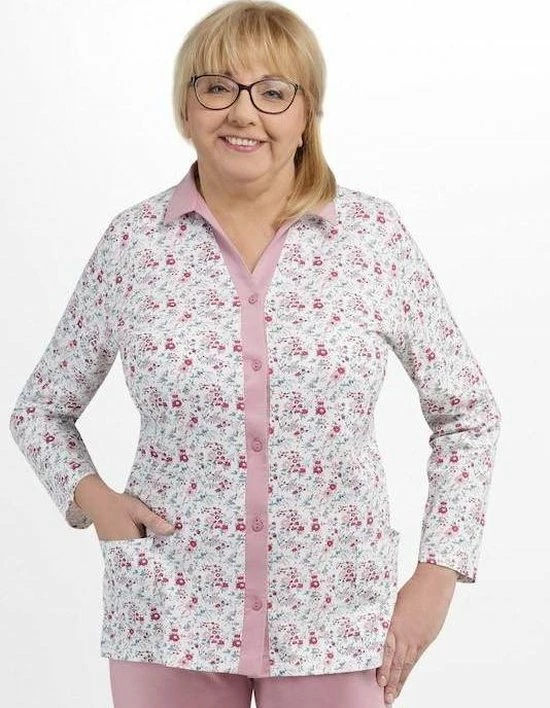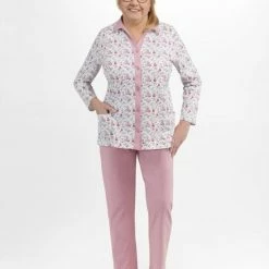 Stijlvolle damespyjama met klasieke modieuze print. De set bevat een wit/ roze blouse met lange mouwen versierd met een bloemen motief en een zeer comfortabele, lange roze broek met een elastische tailleband.