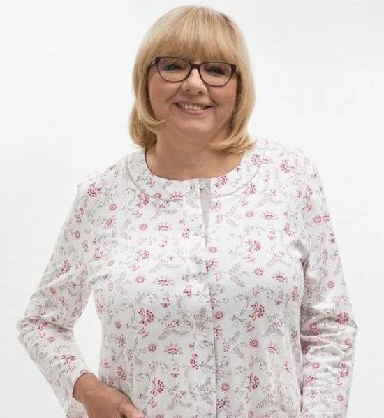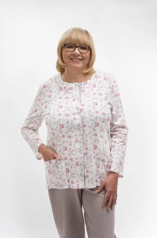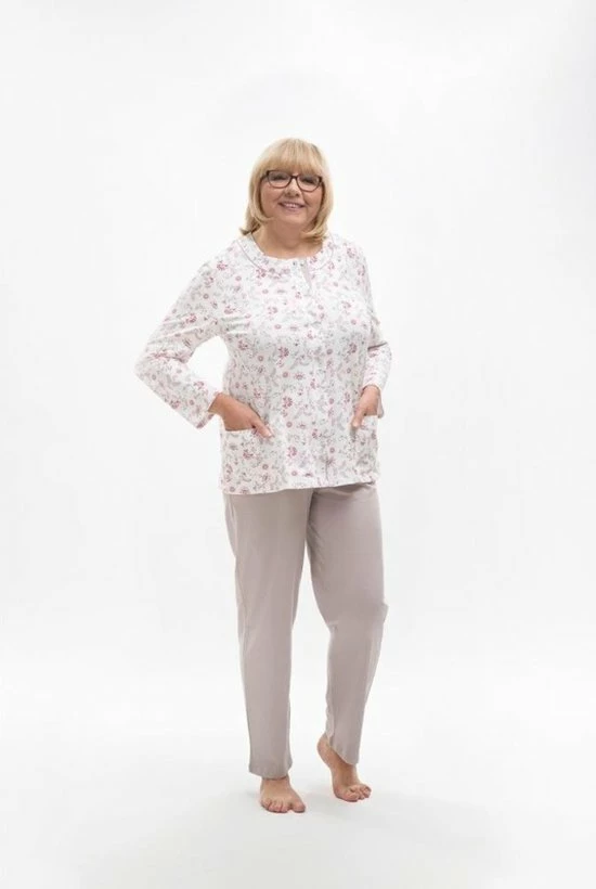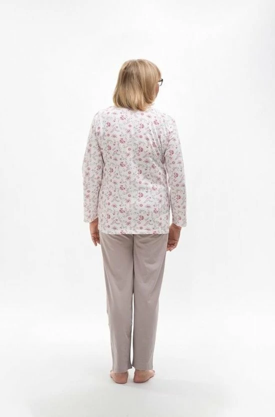 Stijlvolle damespyjama met klasieke modieuze print. De set bevat een wit/ rode blouse met lange mouwen versierd met een bloemen motief en een zeer comfortabele, lange beige broek met een elastische tailleband.