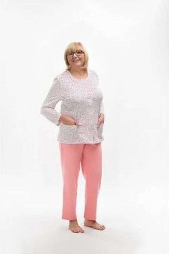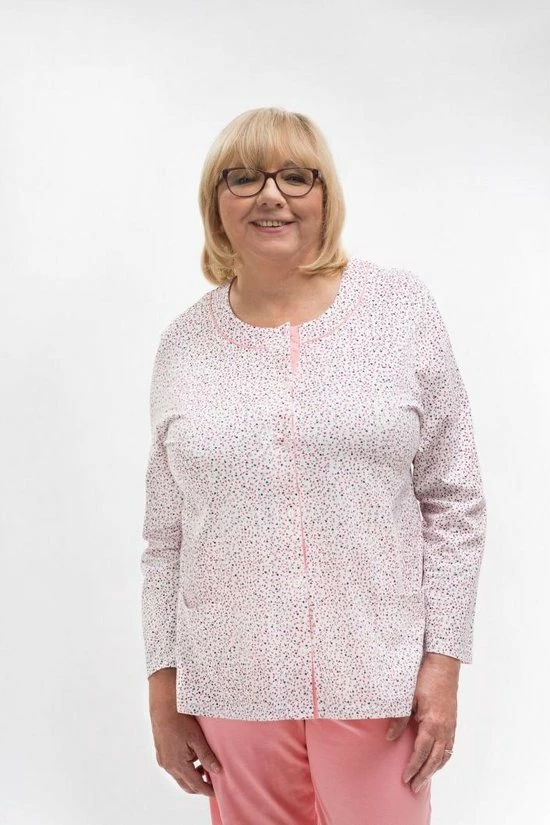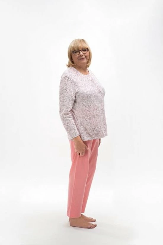 Stijlvolle damespyjama met klasieke modieuze print. De set bevat een wit/ roze blouse met lange mouwen versierd met een bloemen motief en een zeer comfortabele, lange roze broek met een elastische tailleband.