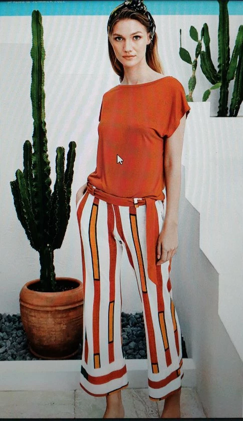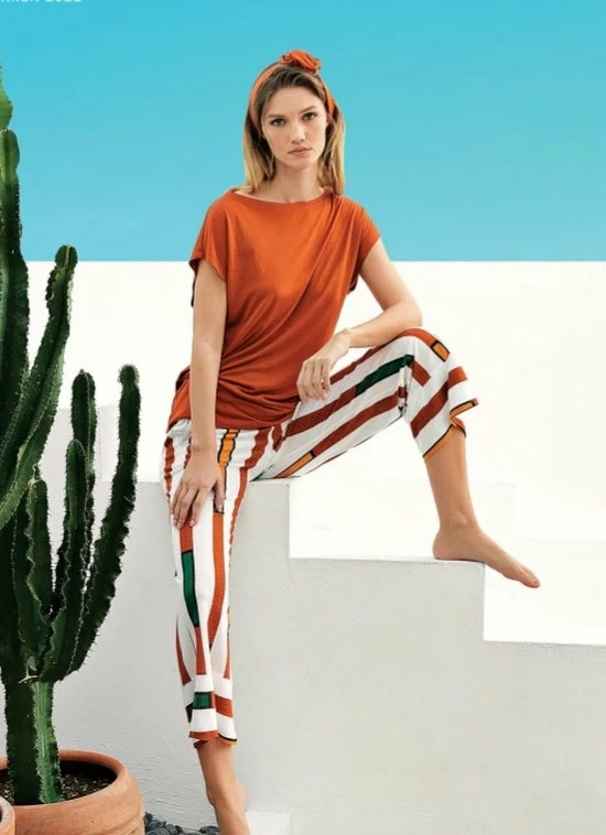 Effen top met korte mouwen en een lange gestreept broek