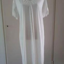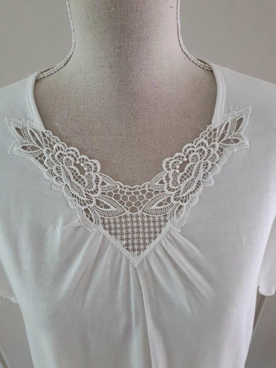 Klassiek effen nachthemd voorzien van romantisch opengewerkt kant. Leuk detail is nog het kartelrandje langs mouw en onderkant nachthemd.Kleur off-white. 100% katoen. Maat 40