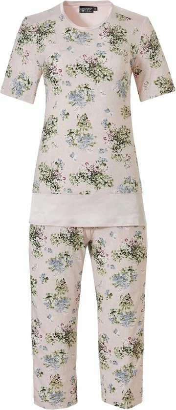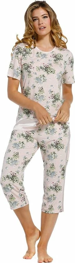Een dames pyjama van het merk Pastunette Deluxe met een sierlijk bloempatroon. De top heeft korte mouwen en aan de onderzijde een strook satijn in de licht roze tint. De driekwart broek is voorzien van zakken en heeft tevens satijnen verticalen stroken aan weerszijden van de broekspijpen. Productspecificaties: Stofsamenstelling: 95% modal, 5% elastan Pasvorm: Normaal Merk en collectie: Pastunette Deluxe Seizoen: Lente/Zomer.