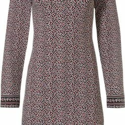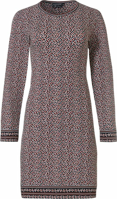 Een licht getailleerd dames nachthemd van het merk Pastunette Deluxe. Het nachthemd heeft een fijn stipjes patroon in de aantrekkelijke kleurencombinatie karamel, wit en zwart. Het nachthemd heeft een mooie ronde halslijn met een sierlijk gestreepte bies. Deze bies komt tevens terug aan de onderzijde van het nachthemd en aan de uiteinden van de lange mouwen. Productspecificaties: Stofsamenstelling: 48% katoen, 48% modal, 4% elastan Lengte: 95 cm Pasvorm: Normaal Merk en collectie: Pastunette Deluxe Seizoen: Herfst/Winter Modal is een biologische textielsoort gemaakt van cellulose uit de beuk. Het is ongeveer 50% hygroscopischer dan katoen.