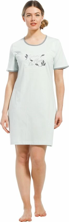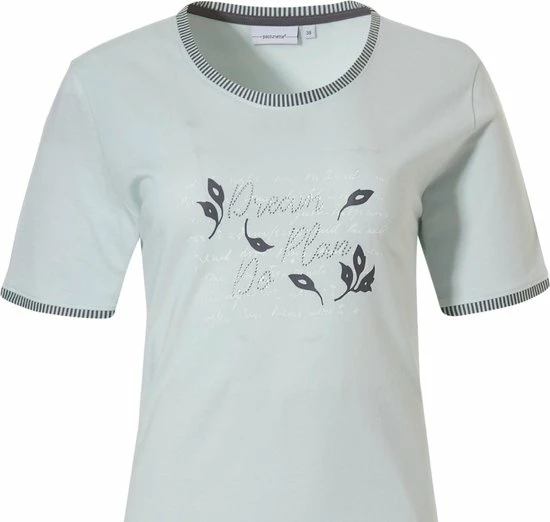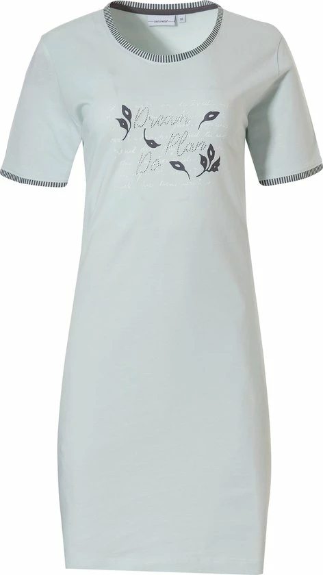 Dit nachthemd heeft een hele zachte mintgroene kleur. De opdruk is wit met antraciet blaadjes en de tekst “Dream, Plan, Do” staat erop in subtiele glinster steentjes. Een ander leuk detail zijn de hals en de boorden van de mouwen. Deze zijn afgezet met een gestreepte stof.