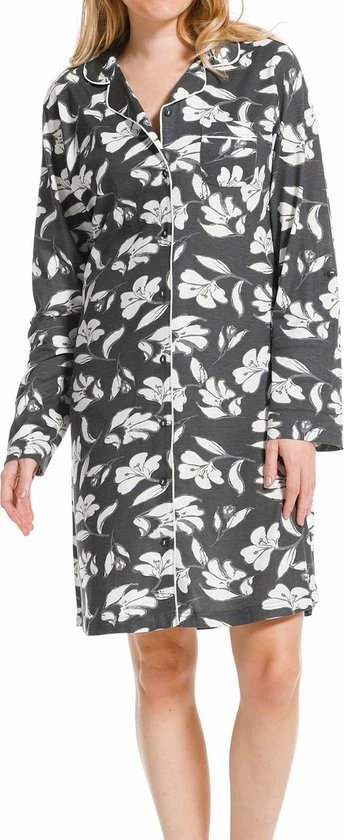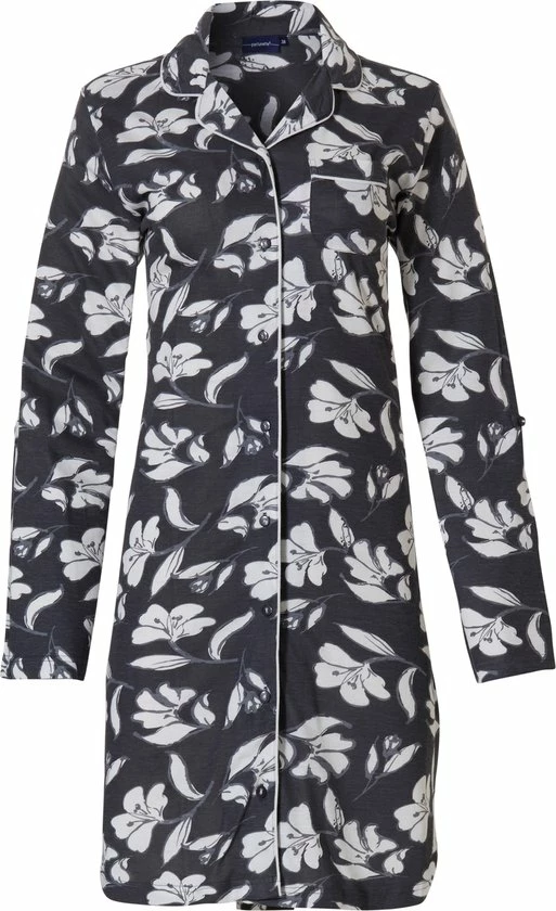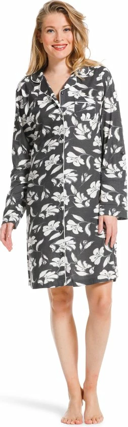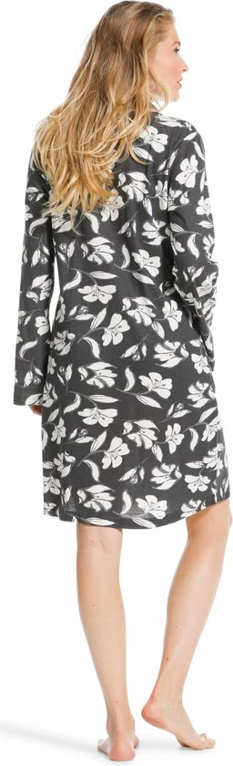 Dit nachthemd is donkergrijs van kleur en heeft een print van witte bloemen. Een leuk detail is dat de witte kleur terug komt in een biesje wat langse de kraag en de knoopsluiting loopt.