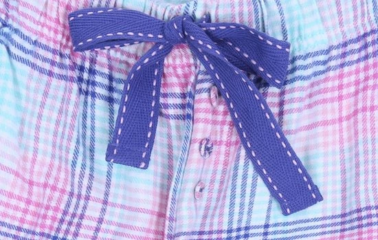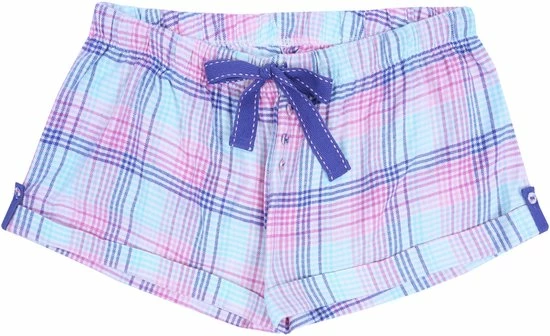 Tweedelige damespyjama, bestaande uit een T-shirt met bandjes en een korte geruite short.