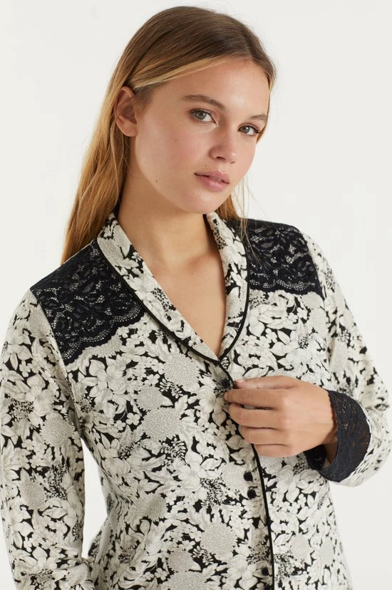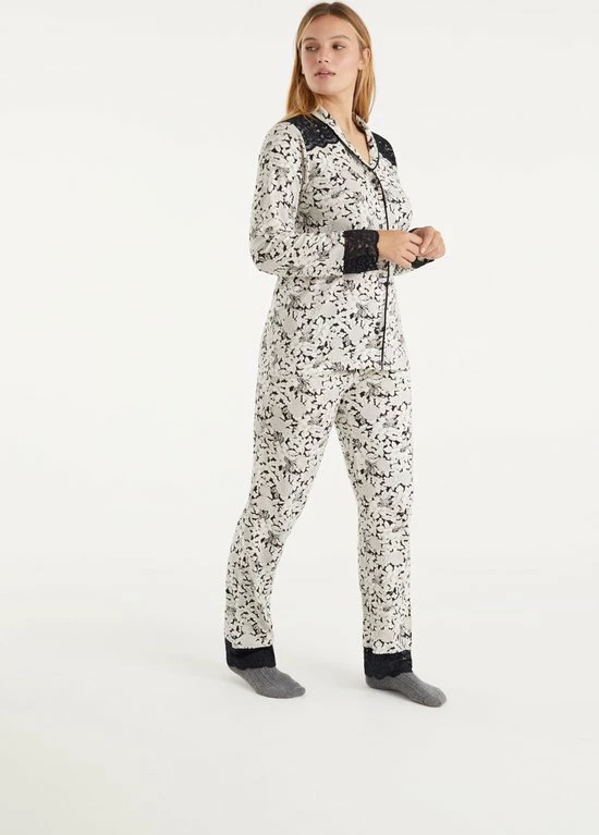 Breeze Pyjama XL van het merk Promise – De Breeze Pyjama van Promise is een 2-delige pyjama set. De set bestaat uit een lange pyjamabroek en een shirt met lange mouwen. In een prachtige off-white en zwarte kleur met bloemen motief. Het shirt wordt gesloten door middel van knoopjes. De mouwen zijn aan de onderkant afgewerkt met kant. De lange broek heeft een elastische band en is aan de onderkant van de pijpen afgewerkt met kant. Het kant komt ook terug op de schouders. Verkrijgbaar in de maten S t/m XL Materiaal: 48% Katoen, 47% Viscose, 5% Elastaan. Bekijk hier alle pyjamaβs van Promise.