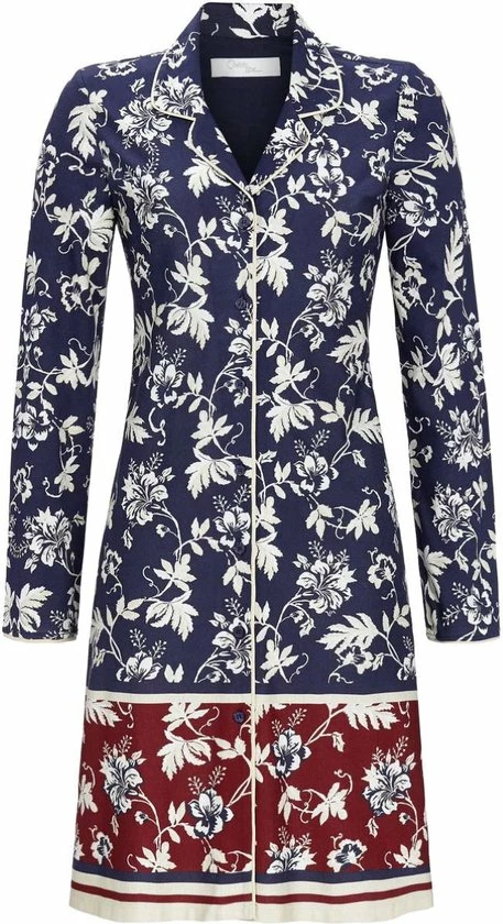 Een luxe doorknoopnachthemd van Ringella uit de ChΓ©rie Line collectie. Het nachthemd heeft lange mouwen en een reverskraag. Langs de knoopsluiting, hals en mouwuiteinden zit een witte bies. Het overgrote gedeelte van het nachthemd is versierd met een prachtig patroon van wat lijkt op witte silhouetten van bloemen en planten op een nachtblauwe achtergrond. De onderkant van het nachthemd heeft, tussen de witte, rode en blauwe strepen in, hetzelfde plantenpatroon, maar dan op een rode achtergrond. Dit nachthemd zorgt voor een prachtige luxe nachtlook. Productspecificaties: Stofsamenstelling: 50% katoen, 50% modal Lengte: 95 cm Merk en collectie: Ringella ChΓ©rie Line Seizoen: Herfst/Winter Modal is een biologische textielsoort gemaakt van cellulose uit de beuk. Het is ongeveer 50% hygroscopischer dan katoen.