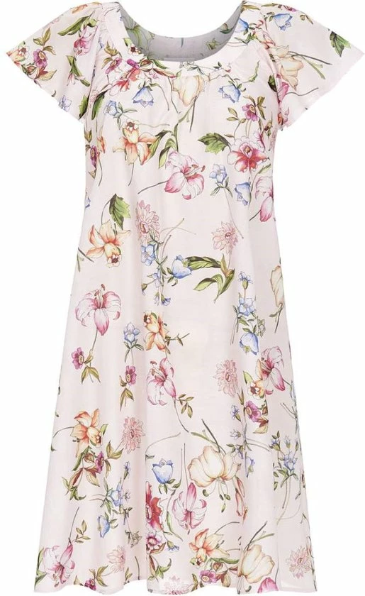 Een geplooid nachthemd van het merk Ringella. Het nachthemd heeft een ronde hals en korte, geplooide mouwen. Het nachthemd heeft een klassiek patroon van prachtige bloemen in verschillende kleuren op een helder orchideekleurige achtergrond. De stof van het nachthemd bestaat uit 100% katoen voile. Voile is een lichte, enigszins doorschijnende stof van glad, sterk geweven en huidvriendelijk katoen. Productspecificaties: Stofsamenstelling: 100% katoen voile (zonder rek) Lengte: 90 cm Merk en collectie: Ringella Seizoen: Lente/zomer