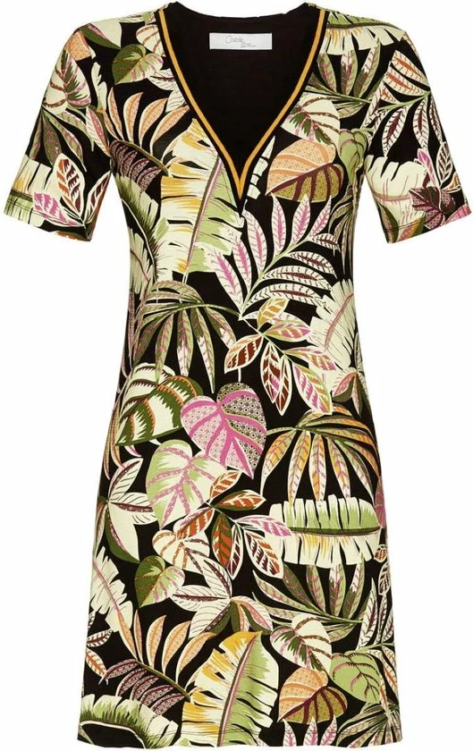 Een nachthemd van het merk Ringella uit de ChΓ©rie Line collectie. Het nachthemd heeft korte mouwen en een diepe V-hals die gedecoreerd is met een oranje lijn. Het patroon van het nachthemd bestaat uit prachtige verschillende soorten varens op een zwarte achtergrond wat zorgt voor een pure en zomerse look. Productspecificaties: Comfort size: Dit artikel heeft een ruime pasvorm. Stofsamenstelling: 95% viscose, 5% elastan Lengte: 90 cm Merk en collectie: Ringella ChΓ©rie Line Seizoen: Lente/zomer Viscose draagt net zo prettig als katoen terwijl de stof zachter en soepeler is en zijdeachtig aanvoelt.