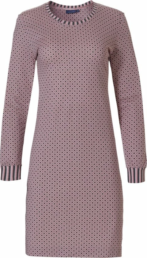Een roze nachthemd van het merk Pastunette. Het nachthemd heeft lange mouwen met boorden en een ronde hals. De boorden en de stof bij de hals hebben grijze verticale strepen. De rest van het nachthemd heeft een grijs grafisch patroon op de roze achtergrond. De onderkant van het nachthemd heeft splitjes. De samenstelling van de stof zorgt ervoor dat het nachthemd comfortabel draagt. Productspecificaties: Stofsamenstelling: 50% katoen, 50% modal Lengte: 95 cm Merk: Pastunette Seizoen: Herfst/Winter Modal is een biologische textielsoort gemaakt van cellulose uit de beuk. Het is ongeveer 50% hygroscopischer dan katoen.