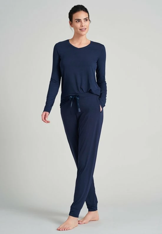 Deze basic mag in geen enkele garderobe ontbreken! De lange damesbroek ziet er gewoon goed uit met haar pure stijl en zijdelingse steekzakken. De brede, elastische tailleband met verstelbare satijnen bindkoord en de wijde pijpen beloven comfort. Jersey van zacht, soepel modal met een vleugje elasthaan zorgt voor puur welzijn. De natuurlijke vezel is bijzonder zacht, ademend en onderhoudsvriendelijk. Uitstekende SCHIESSER-kwaliteit om te mixen en relaxen!