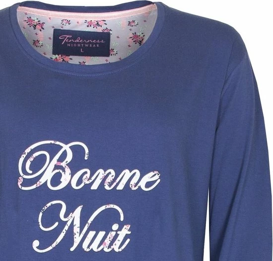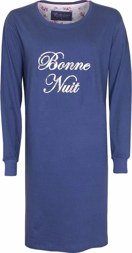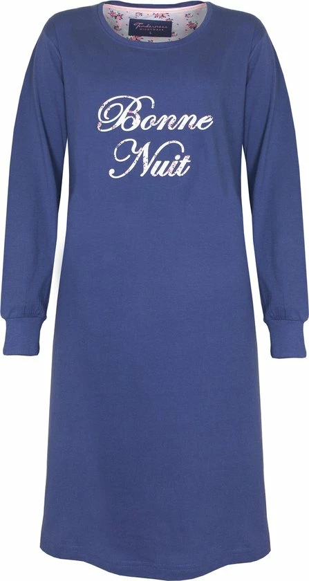 Tenderness dames nachthemd gemaakt van 100 % gekamde katoen. Dit nachthemd is gemaakt in een draagbare en rekbare jersey kwaliteit. Dit unie nachthemd heeft Lange mouwen met unie rekbare boorden voor meer draag comfort, ook heeft dit nachthemd een Ronde hals met een rekbaar boordje en op de borst een gebloemde tekst print (Bonne Nuit). De lengte van dit nachthemd is 95 cm.