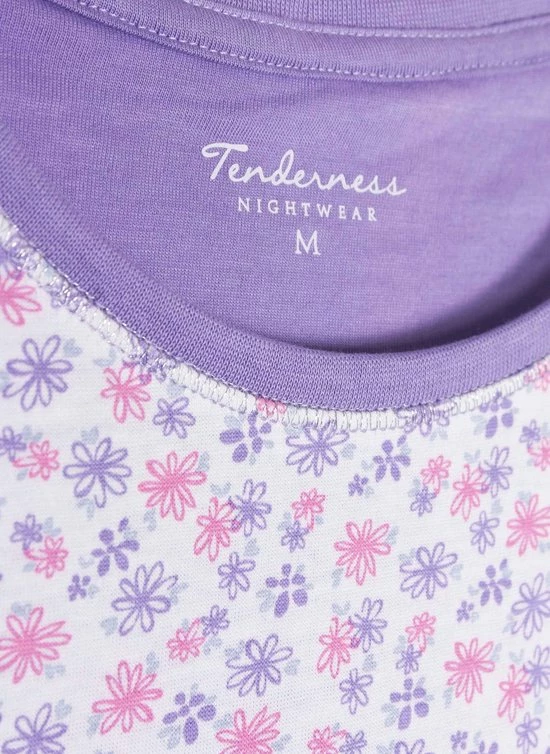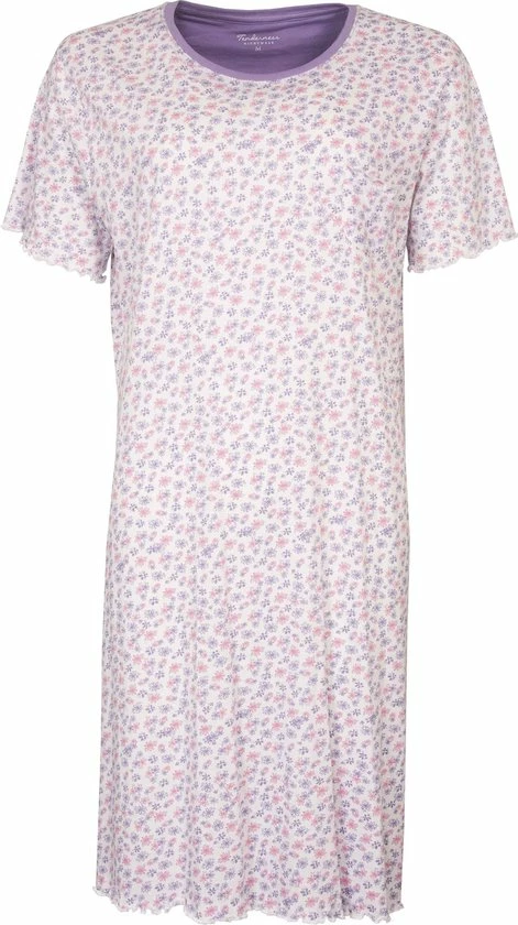 Tenderness dames nachthemd gemaakt van 100 % katoen. Dit nachthemd is gemaakt in een draagbare en rekbare jersey kwaliteit. Het nachthemd heeft een geprint bloemetjes dessin. Met een mooie ronde hals en korte mouwen afgewerkt met Merrow edge. Het nachthemd is voorzien van borstzakje met strikje en een zoom met merrow edge.