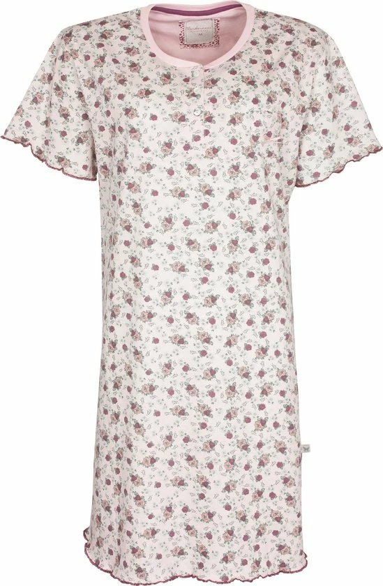 Tenderness Dames Nachthemd gemaakt van 100 % gekamde katoen. Dit nachthemd is gemaakt in een draagbare en rekbare jersey kwaliteit. Dit nachthemd heeft een mooi geheel gebloemd dessin speciaal voor Pyjamaonline ontworpen. Korte mouwen en de zomen zijn mooi afgewerkt met een fantasie steek. Unie ronde hals met polosluiting en een opgestikt borstzakje afgewerkt met een satijnen strikje. Dit nachthemd heeft een lengte van 95 cm en de onderkant is mooi mooi afgewerkt met een fantasie steek.