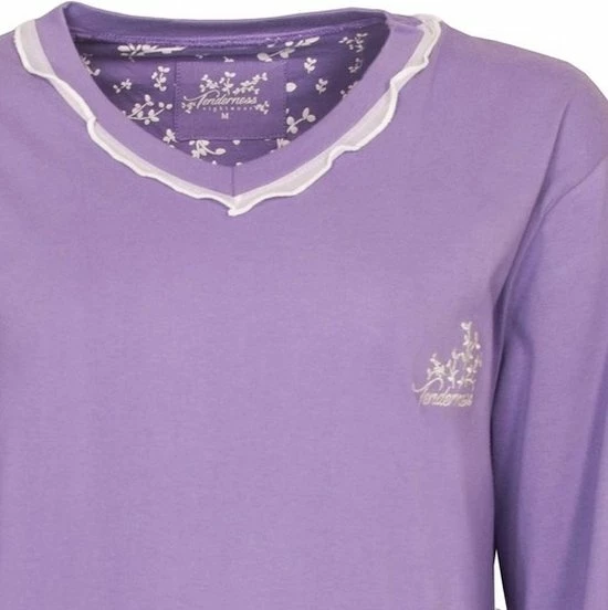 Tenderness dames pyjama gemaakt van 100% gekamde katoen. De pyjama is gemaakt in een draagbare en rekbare jersey kwaliteit. De unie top heeft Lang mouwen met boorden en een boord aan de zoom. De top heeft een V hals afgewerkt met een voile strook en om de top af te maken heeft de top de borst een geborduurd Tenderness logo met bloemetjes. De lange gebloemde dessin broek heeft in de taille een aantrekkoord en heeft boorden aan de enkels. Alle boorden met elasthan voor meer draagcomfort.