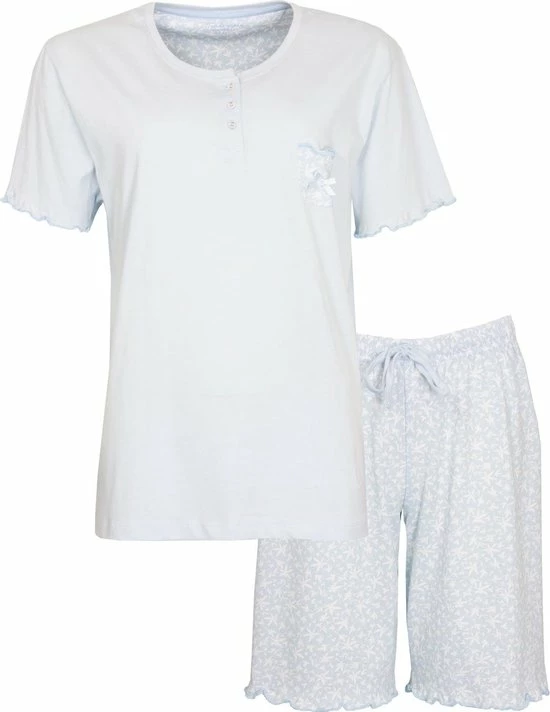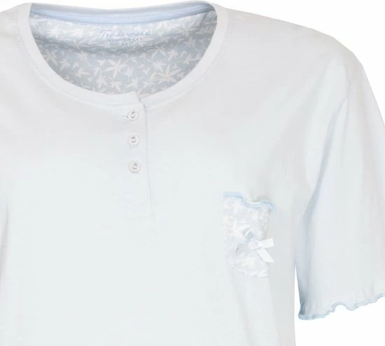 Tenderness dames shortama gemaakt van 100 % katoen. De shortama is gemaakt in een draagbare en rekbare jersey kwaliteit en voorzien met elasthan voor meer draagcomfort. De top heeft een opgestikt borstzakje met een satijnen strikje en korte mouwen. De ronde hals heeft een polo sluiting met knoopjes. Korte broek is in een geprint dessin en met aantrekkoord.