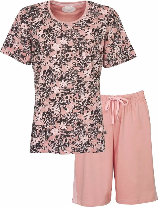enderness Dames Shortama gemaakt van 100 % katoen. Deze shortama is gemaakt in een draagbare en rekbare jersey kwaliteit. Deze Dames Shortama is speciaal voor Pyjamaonline. ontworpen. De top is geprint in een mooi bloemen dessin en heeft korte mouwen, een ronde hals met rimpeltjes onder de hals. Ook heeft de top op de borst een opgestikt borstzakje. De unie korte broek heeft in de taille een elastische tailleband met een aantrekkoord voor meer draag comfort. De korte broek heeft een lengte van 50 CM.