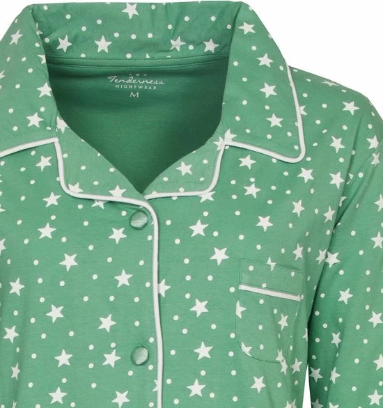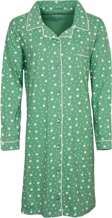 Tenderness Doorknoop dames nachthemd gemaakt van 100 % gekamde katoen. Dit nachthemd is gemaakt in een draagbare en rekbare jersey kwaliteit. Dit nachthemd is geheel in een geprinte sterren dessin en heeft een Doorknoop model met stof overtrokken knopen en rever kraag. De Lange mouwen, de kraag sluiting en manchetten zijn mooi afgewerkt met een wit biesje, ook heeft dit nachthemd op de borst een opstikzakje. Dit nachthemd heeft een lengte van 95cm.