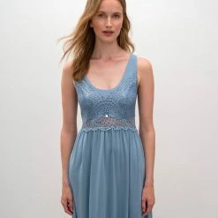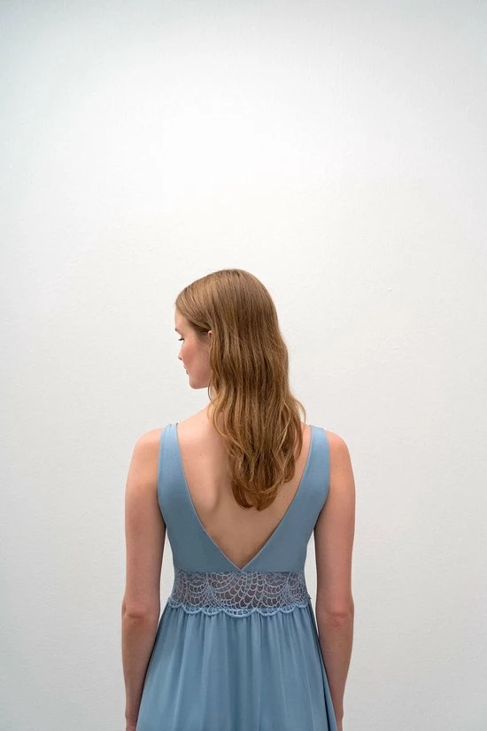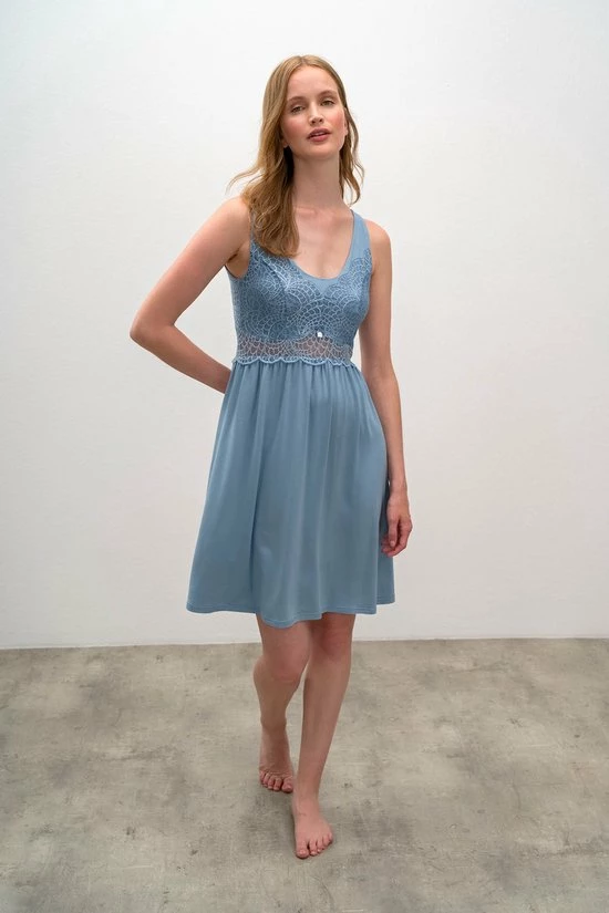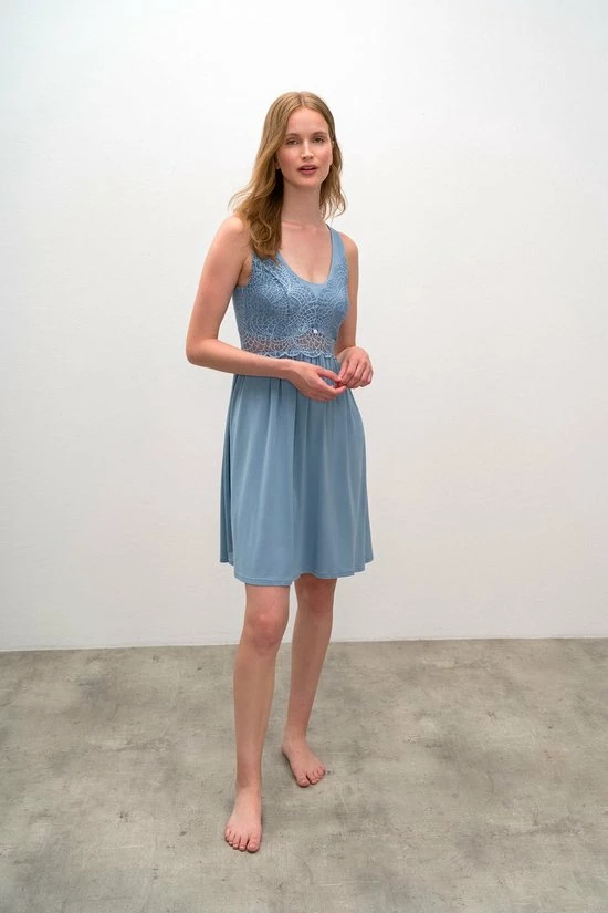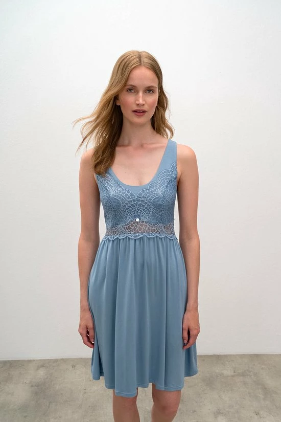 Een mouwloos damesnachthemd met een prachtig kant aan de voorkant en een V-uitsnede aan de achterkant. Het kant, het belangrijkste detail van deze nachtjapon, geeft het gevoel van hoge luxe.