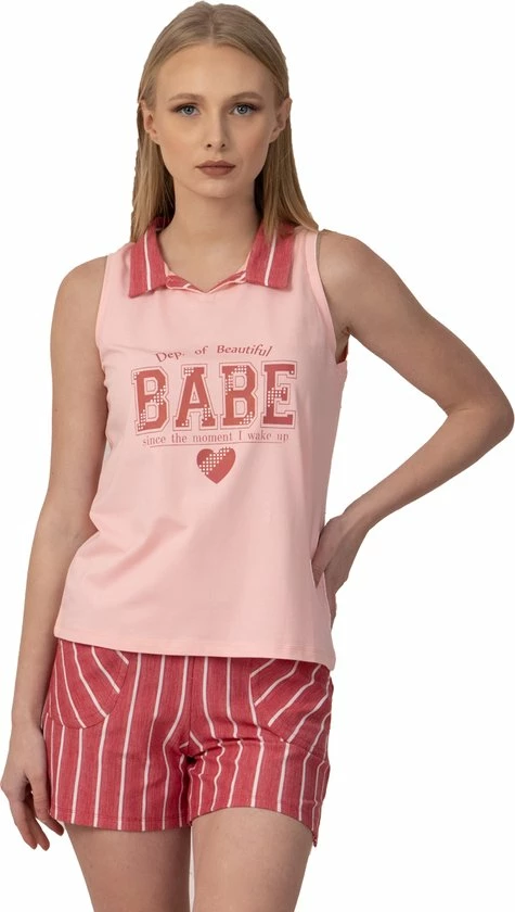 Deze korte pyjama voor dames is een zomerfavoriet! Door zijn geweldige kleuren krijgt u zin in de zomer. Het roze T-shirt met ronde hals zit heerlijk comfortabel en heeft een aangename kraag. De korte broek met witte strepen past hier uitstekend bij. U zult versteld staan van het materiaal. De pyjama is van zacht katoen wat aangenaam op de huid aanvoelt. Geniet van de zomer met Vanilla!