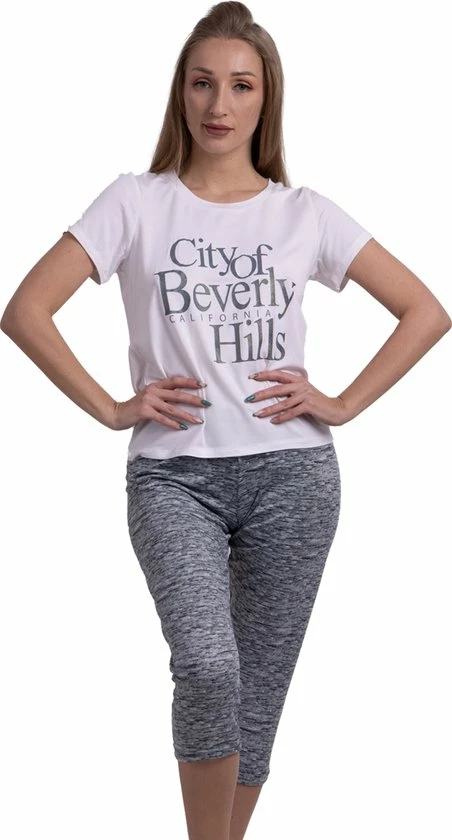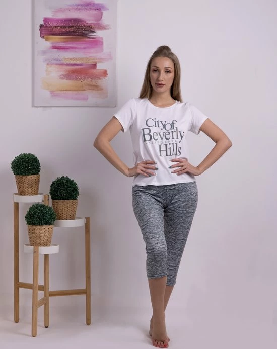 Heerlijke driekwartpyjama voor dames. Deze pyjama komt een witte T-shirt met ronde hals. Het topje heeft een print met de tekst City of Beverly California Hills. De driekwartsbroek heeft een aangename pasvorm en heeft een mooie effen print. Zowel het topje als de broek zijn van viscose wat de huid heerlijk zacht streelt. Een prachtige pyjama voor de zomer uit onze nieuwe collectie!