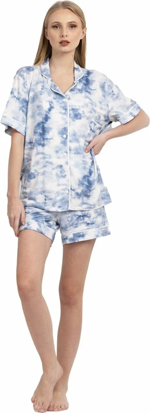 Een prachtige opvallende pyjama voor dames! Deze pyjama met korte mouwen en korte broek voor dames is heerlijk zacht van viscose waardoor het zowel mooi als comfortabel is. De pyjama is lichtblauw en heeft een mooi patroon. De top met zijn iets wijdere silhouet, een aangename reverskraag en een afgeronde zoom biedt u veel bewegingsvrijheid. Fantastische Vanilla pyjama om in te dromen!