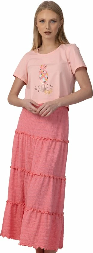 Zoek jij een pyjama waar je heerlijk in kunt slapen? Dan is dit een uitstekende keuze. De pyjama komt met een roze shirt met korte mouwen. Het shirt heeft een ronde hals en is afgewerkt met een leuke print. Deze pyjama heeft geen broek maar een onderjurk, waar je uitstekend in kan bewegen. Perfect voor als je geen broek wilt dragen. Heerlijke damespyjama uit onze nieuwe collectie!