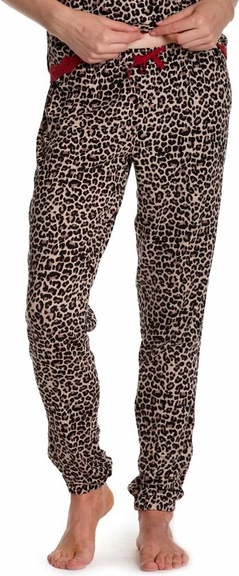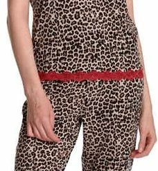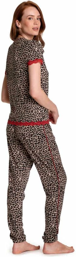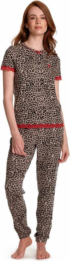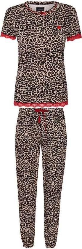 Vive Maria. Amour Fou Pyjama leo allover. Deze fantastisch mooie Vive Maria pyjama bestaat uit twee delen en is gemaakt van een comfortabele viscose stof met elasthaan. De print toont een trendy luipaardprint. De top sluit nauw aan en heeft korte mouwen die zijn afgewerkt met een rand van rood, transparant kant. De ronde halslijn heeft een rood contrasterend stiksel en een rode satijnen strik die de halslijn siert. Een geborduurd rood hart en de letters ‘VM’ bevinden zich op de linkerborst. De onderste zoom is ook afgewerkt met een rode transparante kanten rand.