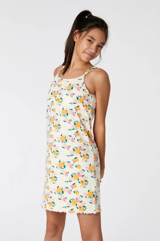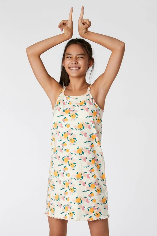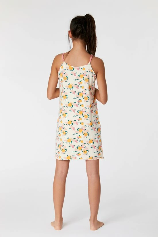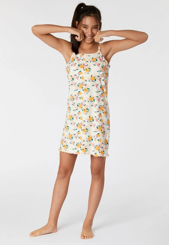 Studio Woody slaapkleedje voor meisjes en dames van zacht beige rekbaar en soepel katoen met een allover print van perzikjes. Dit kort modelletje heeft spaghettibandjes en voelt heel zomers aan. Zeker meenemen in je koffer naar de zon!